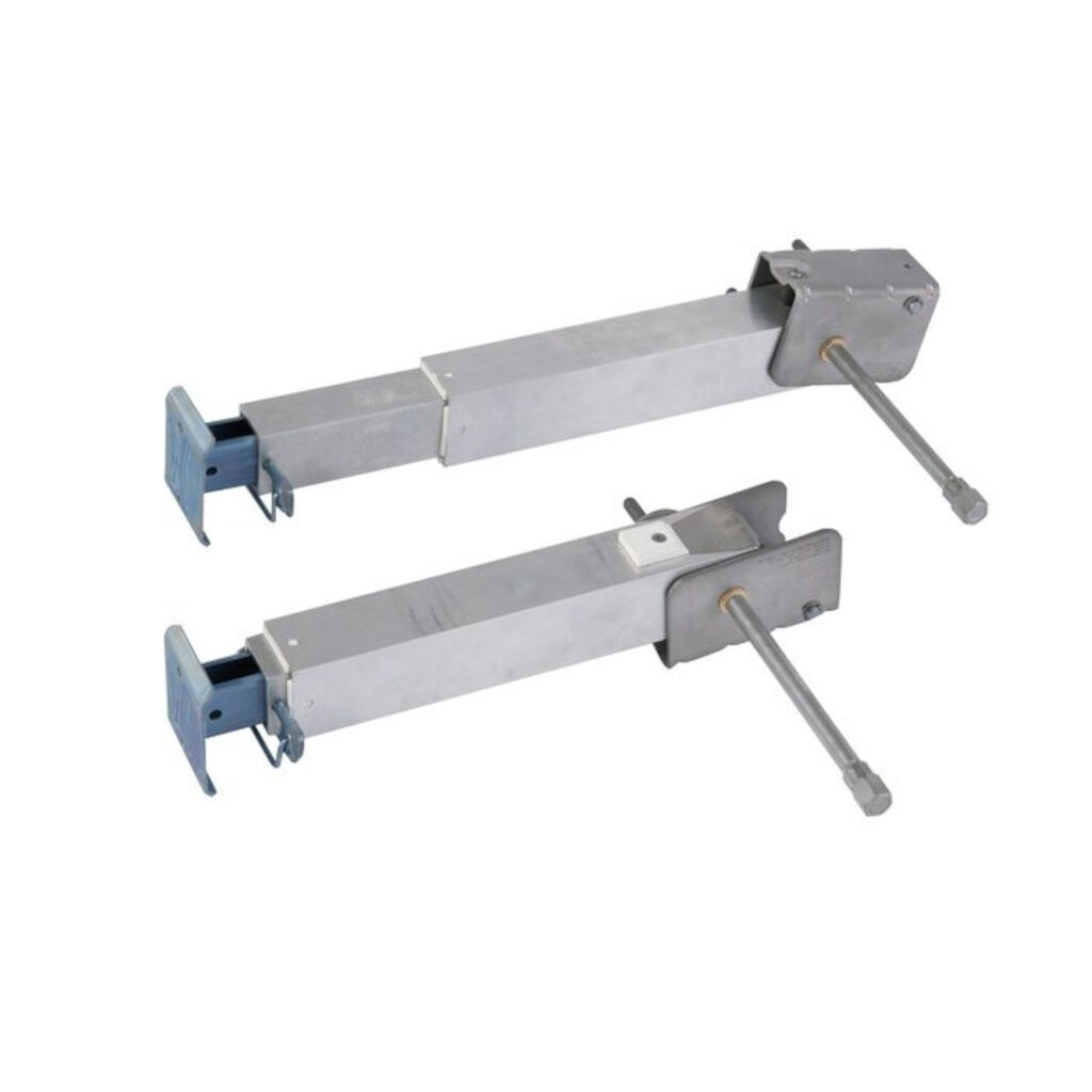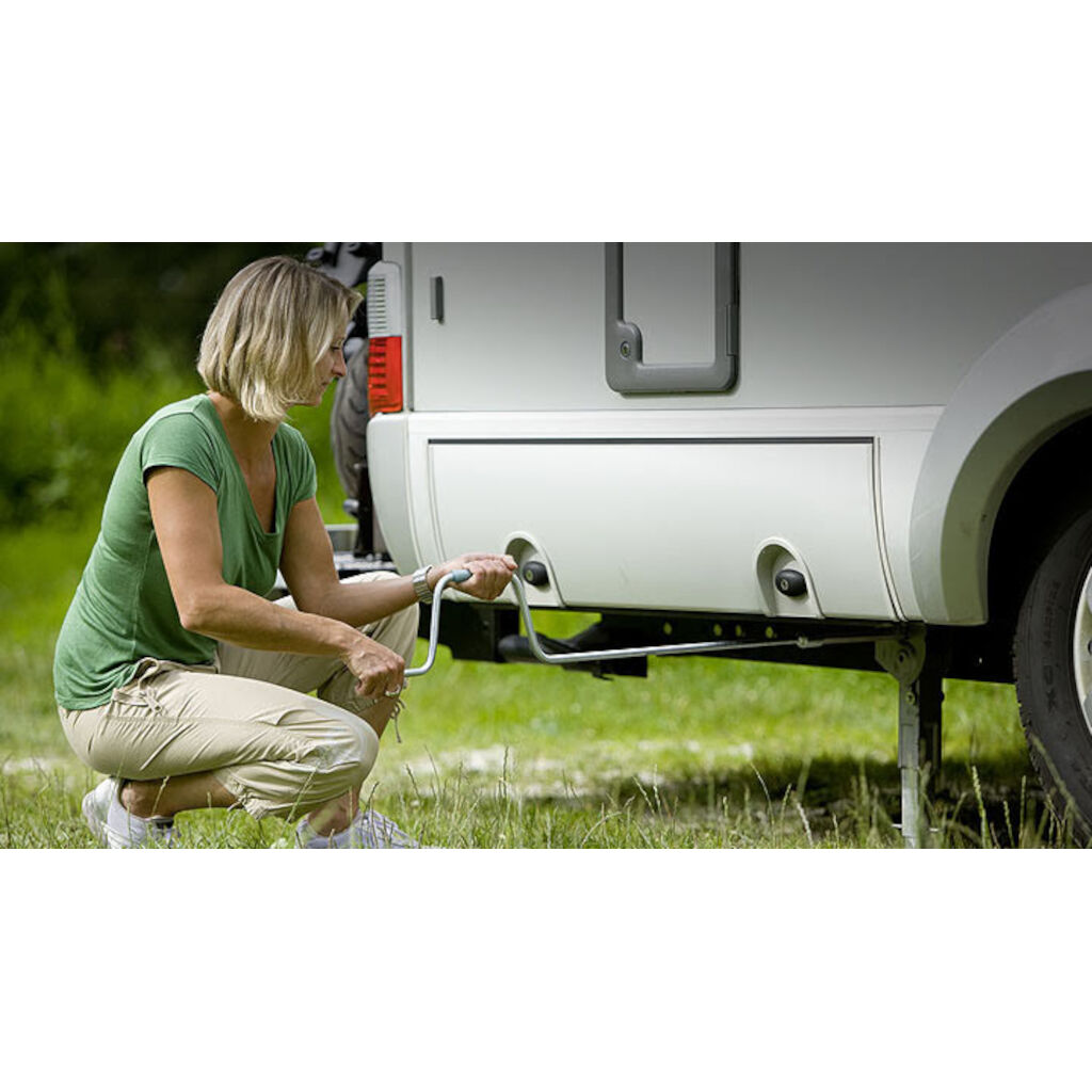 Steunpoten voor montage aan de achterzijde van campers met een AL-KO AMC chassis. Ze kunnen ook op andere frames worden gemonteerd, maar dit vereist het boren van gaten en mogelijk extra versteviging. De steunpoten worden handmatig omhoog en omlaag gedraaid (Let op: slinger niet inbegrepen). In de eindpositie draait de slinger omhoog en klikt automatisch vast, zodat de poten niet per ongeluk naar beneden klappen tijdens het rijden. De ClickFix-steunpoten beschikken ook over een geïntegreerd veiligheidsmechanisme dat het mogelijk maakt om te vertrekken, zelfs als de steunpoten zijn uitgeschoven, waardoor schade aan zowel de steunpoten als de camper wordt voorkomen.