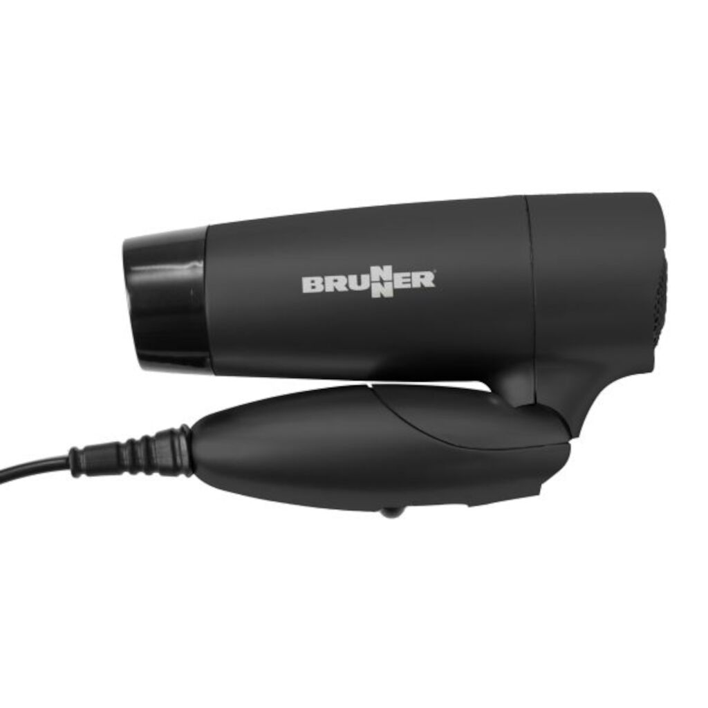 Reisföhn met ruimtebesparend opvouwbaar handvat. Kan worden aangedreven met zowel 230 V als 110 V. Behuizing van duurzaam plastic. Met opbergtas.
