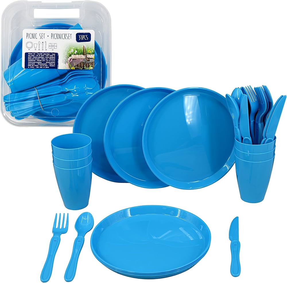 Compleet servies voor 6 personen met 31 delen en een opbergdoos. De picknickbox wordt geleverd in een praktische opbergdoos met deksel en handvat waarin het hele servies past. Perfect voor de camping, het strand of een picknick.