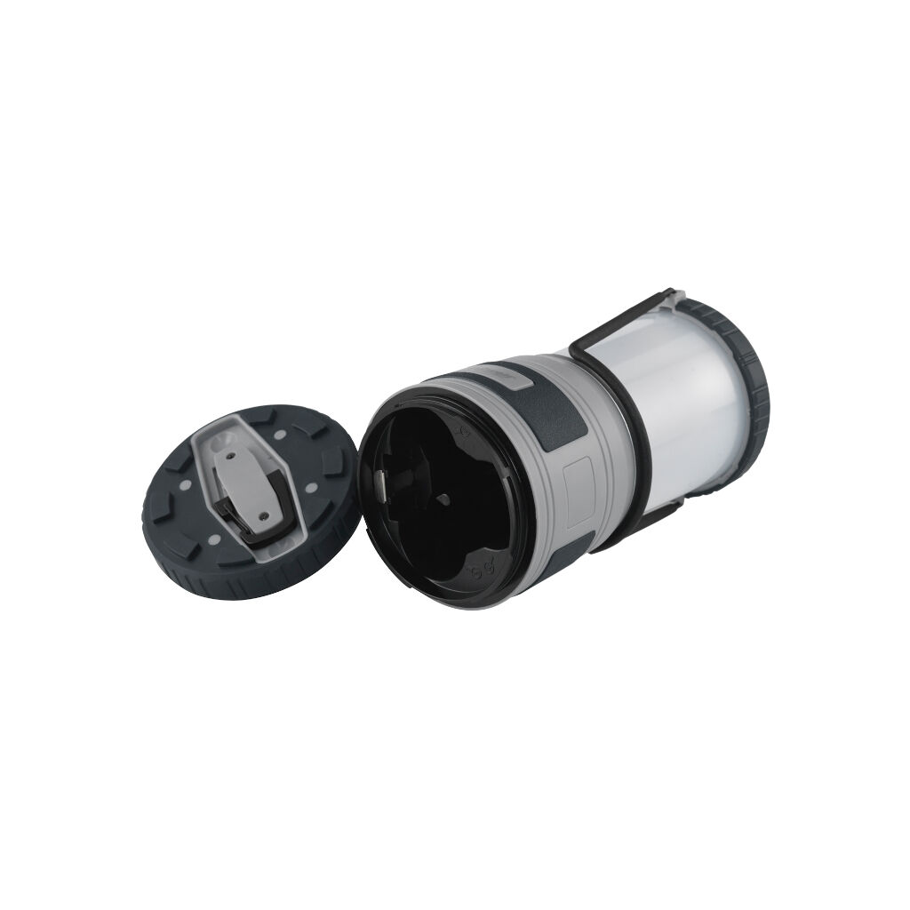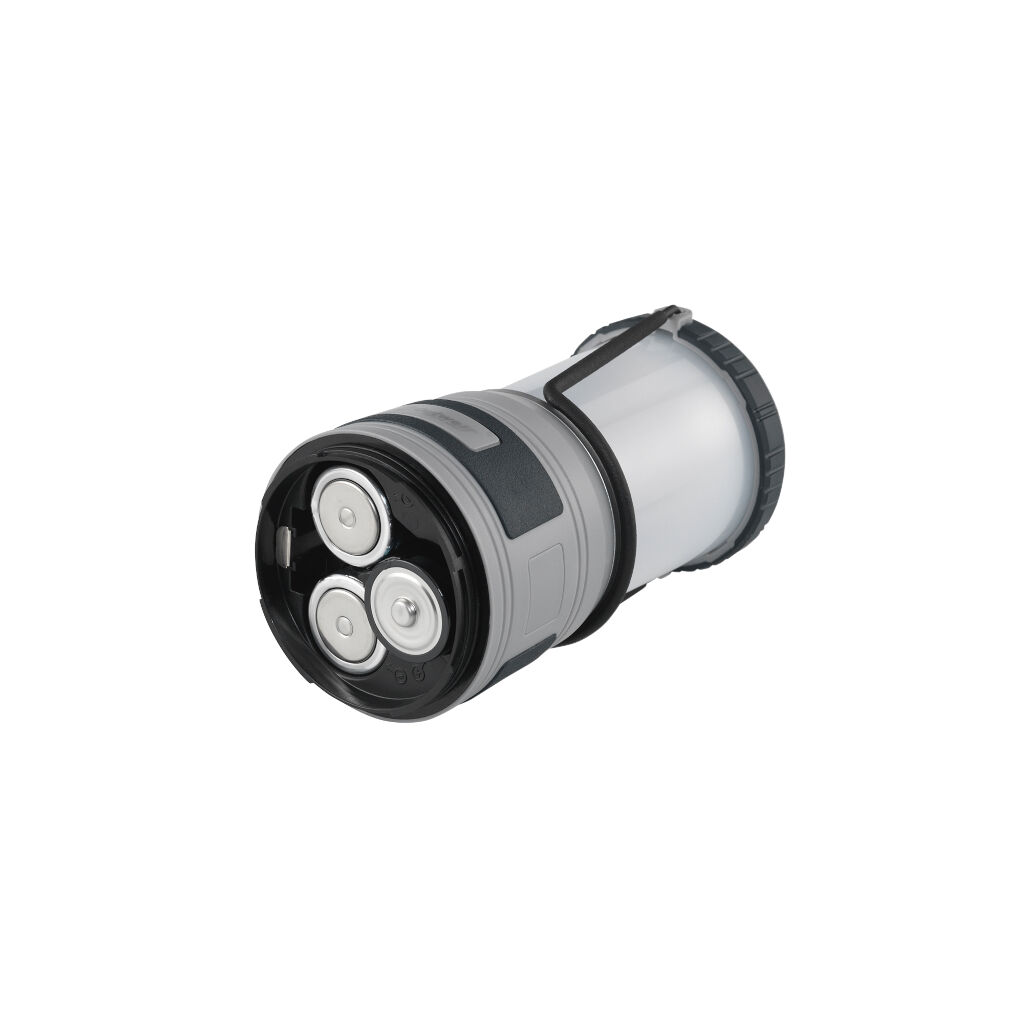 Heldere campinglamp met draaghendel. Dankzij een haak aan de onderzijde en de afneembare bovenkant kan hij in de tent als plafondlamp worden gebruikt. Werkt op 3 AA-batterijen (niet inbegrepen).