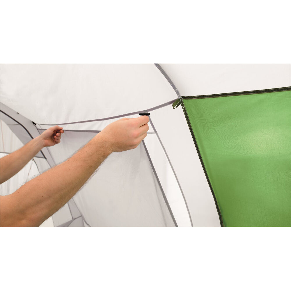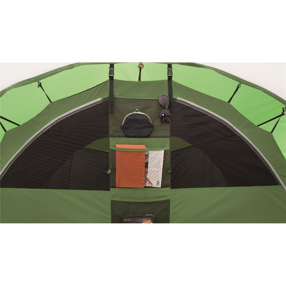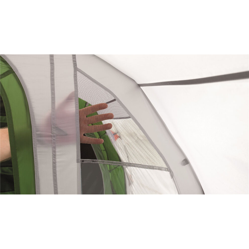 De ventilatie van de gezinstent is royaal met een grote regelbare ventilatieopening achter de slaapcabine en twee regelbare ventilatieopeningen aan de voorkant. De voordeur kan ook volledig worden geopend om extra luchtstroom te creëren. Dankzij een extra gaasdeur kan deze worden gebruikt om de tent te ventileren, zelfs als er insecten in de buurt zijn. De zonbescherming aan de voorkant biedt goede bescherming tegen regen en wind voor de ingang, vergemakkelijkt koken bij slecht weer en biedt wat extra schaduw op warme dagen. Het is ook geschikt voor het opbergen van schoenen, speelgoed of uitrusting.