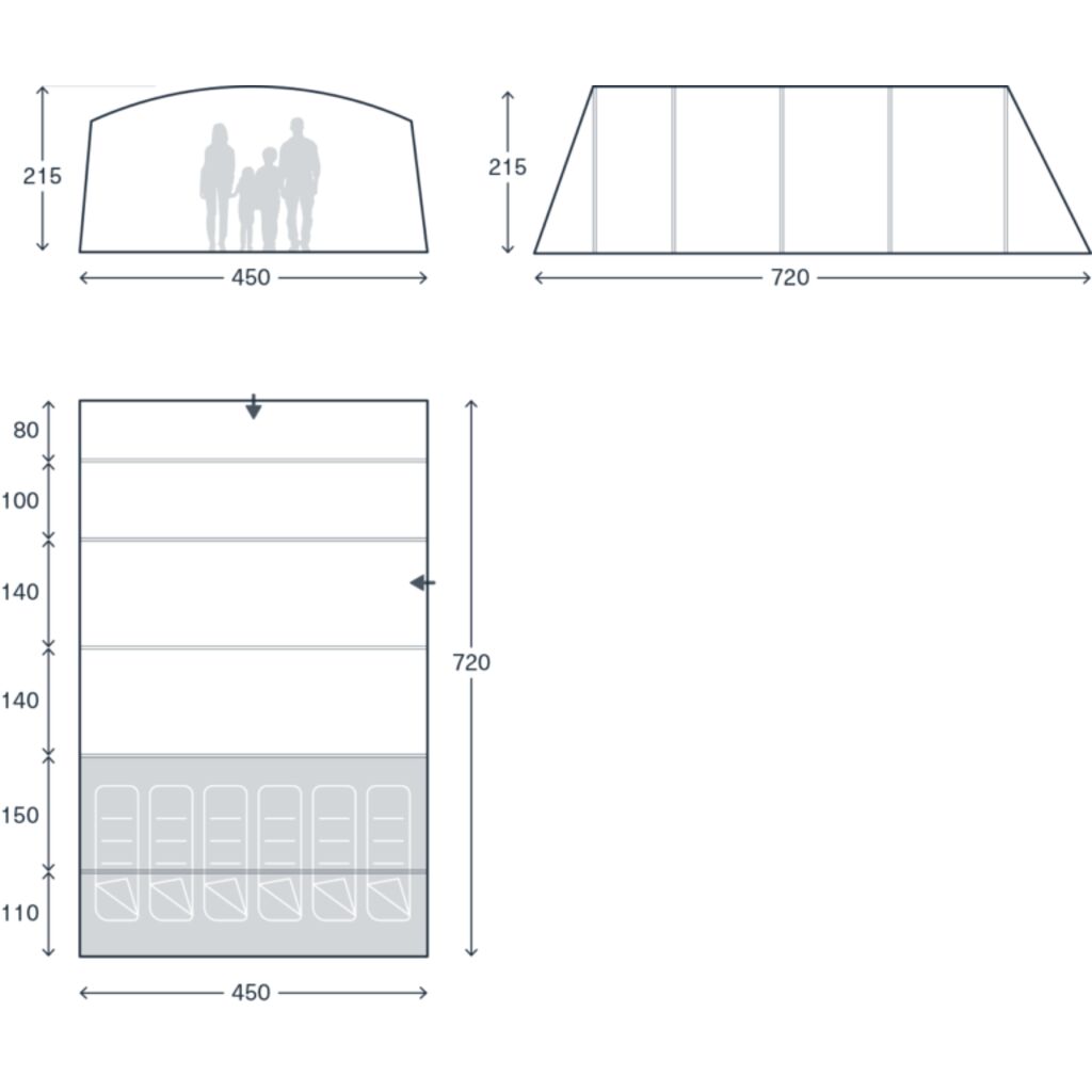 Saunton AIR 06 is een familietent geschikt voor maximaal 6 personen. We raden deze ook aan voor gezinnen met drie kinderen, omdat de extra ruimte in de slaapcabines plaats biedt voor bagage en bredere bedden. De ruime leefruimte met grote ramen maakt de tent licht en aangenaam om in te verblijven – ongeacht het weer is er voldoende ruimte om te eten en samen te zijn. De grote vooropening kan in twee delen worden geopend: volledig op warme dagen of gedeeltelijk voor extra bescherming tegen wind en inkijk. Een vastgestikte kuipvloer beschermt tegen wind, insecten en vuil.