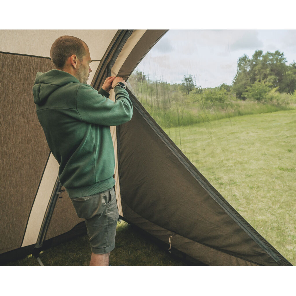 De leefruimte in Outwell Alabama 6 Air TC is doordacht ingericht met een ingenaaid grondzeil dat beschermt tegen vocht en vuil. De grote ruimte is perfect voor diners, gezellig samenzijn of ontspanning en kan eenvoudig worden ingericht voor een huiselijk gevoel. De grote ramen zorgen voor veel daglicht en ingebouwde gordijnen maken het mogelijk om inkijk en licht te regelen. De binnententen bestaan uit drie ruime kamers met verduisterend materiaal dat uitstekend slaapcomfort biedt en flexibiliteit dankzij verstelbare scheidingswanden. De voorzijde is flexibel en kan worden gebruikt voor opslag of volledig worden geopend voor een luchtige en uitnodigende ingang.