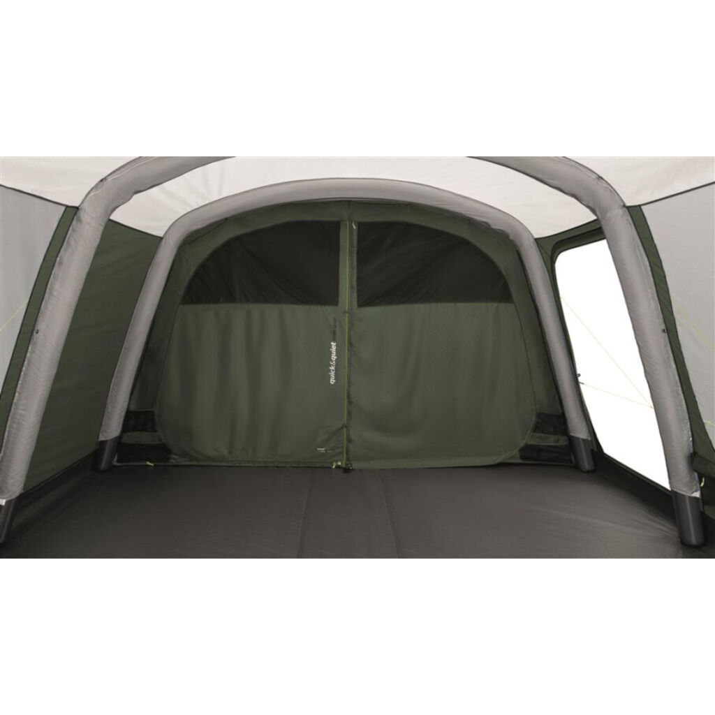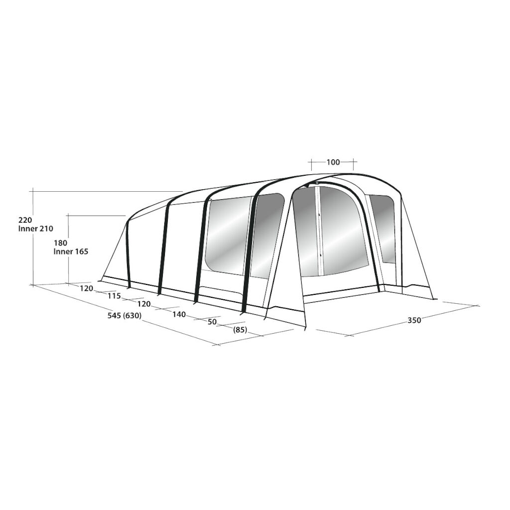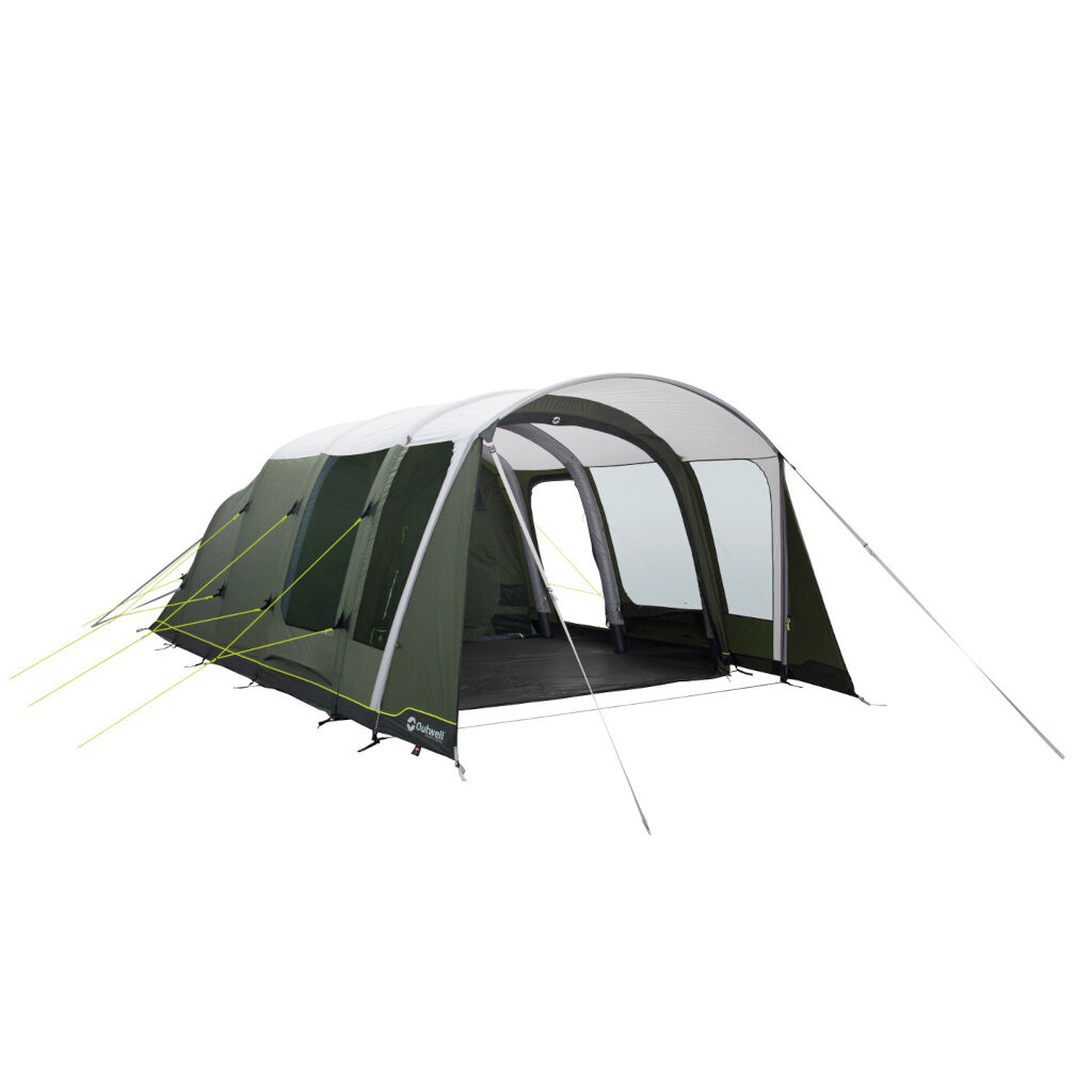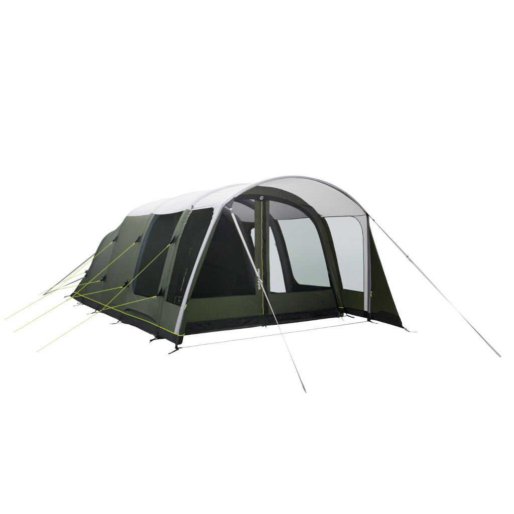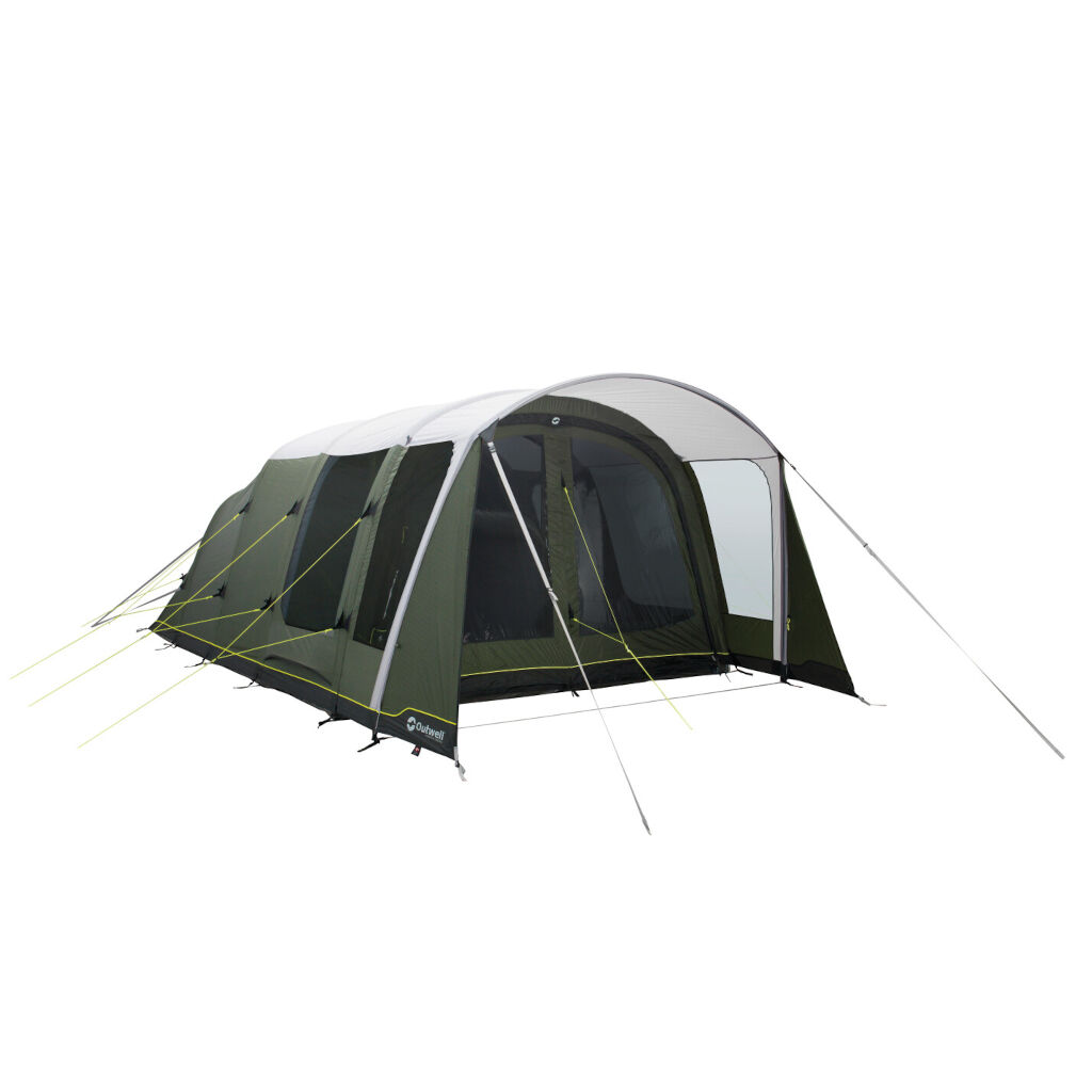 Snel opzetbare 5-persoons familietent van Outwell die luchtkanalen gebruikt in plaats van gewone stokken. Een diep zonnedak met ramen aan de zijkanten biedt een schaduwrijke plek om te eten of gewoon te zitten en te ontspannen. De voorkant biedt ook ruimte voor uitrusting die men wil beschermen tegen slecht weer, maar niet in de tent wil hebben. Twee donkere slaapkamers, een grote woonruimte en twee deuren waarvan de voorste de hele tent opent op warme dagen.