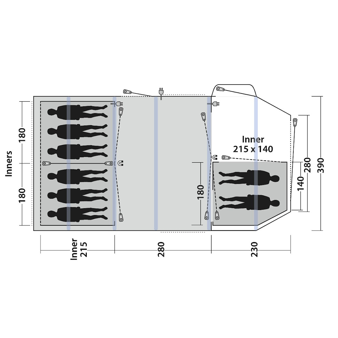 De grote slaapcabine achter in de tent is verdeeld in twee slaapkamers (3+3). De wanden tussen de slaapkamers kunnen worden verwijderd als je de hele familie in één grote slaapkamer wilt samenbrengen. De kleinere slaapcabine vooraan is geschikt voor twee personen en voor gezinnen die geen acht slaapplaatsen nodig hebben, kan deze worden gedemonteerd, gebruikt als logeerkamer of voor het opbergen van uitrusting. Een steviger donker doek in de slaapcabine en in het buitendoek boven de grote slaapcabine vermindert het effect van de grootste vijand van veel tentkampeerders, de ochtendzon. De grote slaapcabine heeft ook een gordijn dat kan worden neergelaten over de ventilatieopening om het licht dat via de achterste ventilatie van de tent binnenkomt te verminderen.
