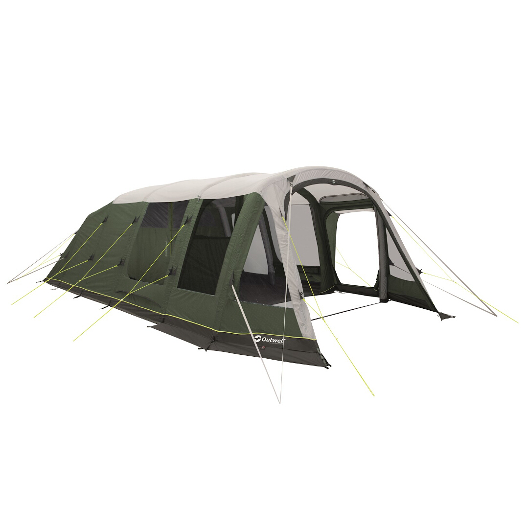 In plaats van stokken maakt de familietent gebruik van de Rigid Air-technologie van Outwell, waarbij de stokken zijn vervangen door luchtkanalen voor eenvoudige montage. De vijf kanalen worden eenvoudig opgeblazen via het ventiel aan de onderkant van één kant van de tent, wat zowel snel gaat als het mogelijk maakt om de tent op te zetten wanneer deze is opgezet. Naast de eenvoudige montage heeft de tent een duurzaam tentdoek dat niet alleen bestand is tegen regen en wind, maar ook minder ritselt dan eenvoudigere doeken wanneer het beweegt. Grote ramen zorgen voor een lichte en aangename tent en als je de inkijk wilt verminderen, zijn er gordijnen op alle ramen.