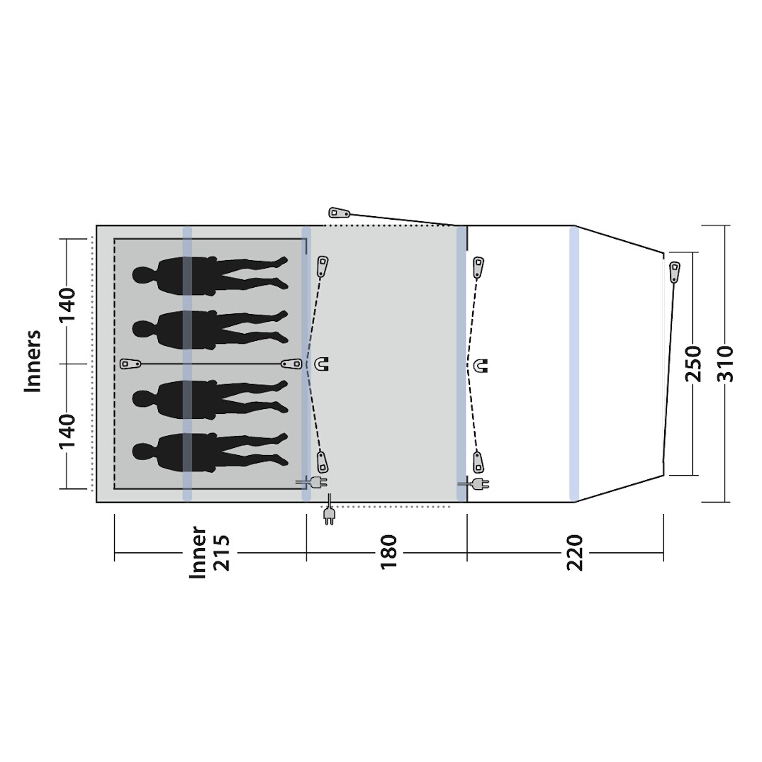 De deur tussen de woonkamer en de buitenruimte en de deur naar een van de slaapkamers hebben naast de rits een magneetstrip zodat deze zonder rits geopend en gesloten kan worden. Een oplossing die het gemakkelijk maakt om tussen de kamers van de tent te bewegen, de slaapcabine in en uit te gaan zonder de rest van de familie wakker te maken en de tent in en uit te gaan zonder de rits te hoeven gebruiken (als de buitendeur open is).