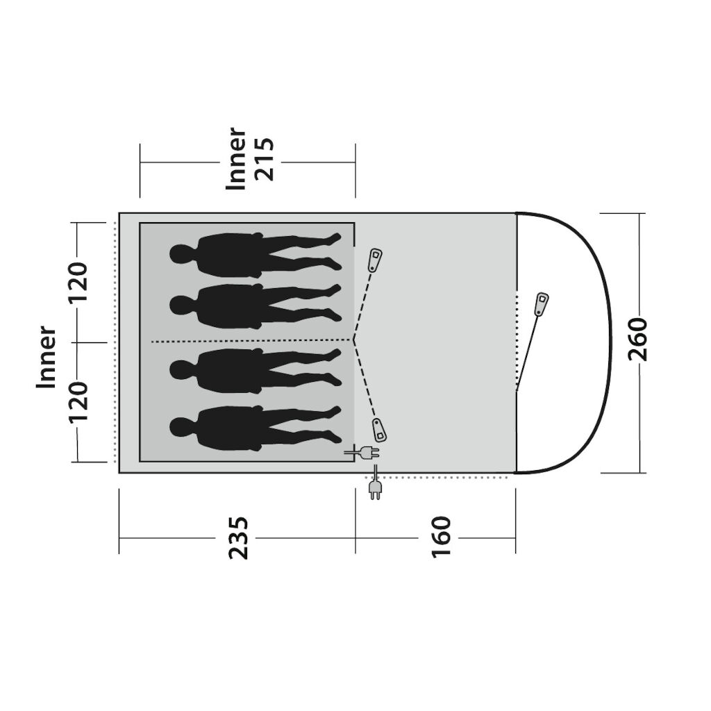 Familietent voor de actieve familie met maximaal twee kinderen die op zoek is naar een tent die eenvoudig op te zetten is, maar ook ruimte biedt om 's avonds of bij slecht weer samen te zijn. Een vastgenaaide vloer over de hele tent zorgt voor een goed klimaat in de tent en beschermt tegen tocht, vocht en kleine insecten. Een woonkamer met ruimte voor meubels biedt een plek om 's avonds en bij slecht weer te zitten en samen te zijn. Slaapcabine met donkere wanden en twee slaapkamers waar de tussenwand kan worden geopend als men de familie in één grote slaapkamer wil samenbrengen.