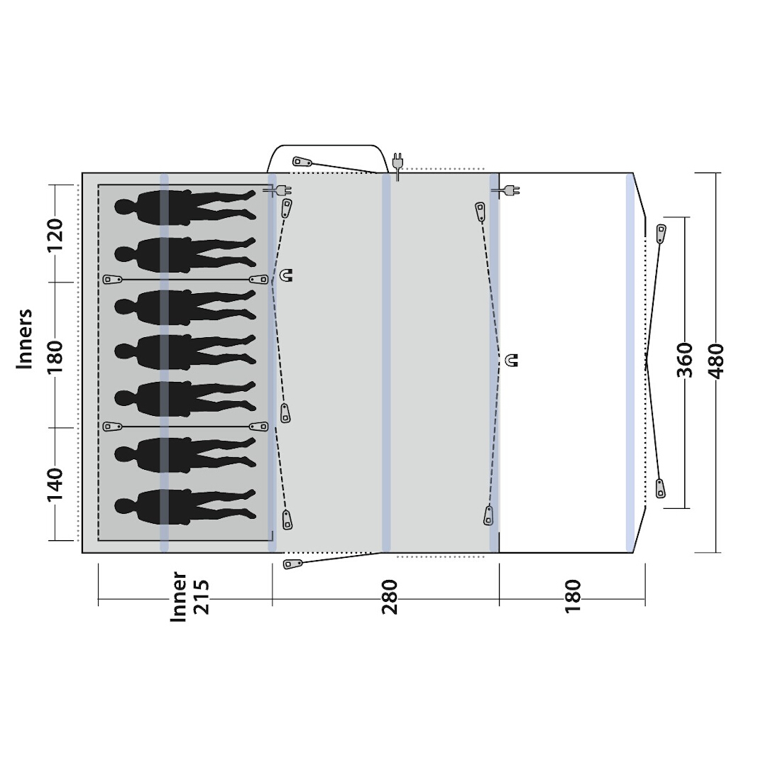 De grote slaapcabine achter in de tent is verdeeld in drie slaapkamers (2+3+2). De wanden tussen de slaapkamers kunnen worden verwijderd als je de hele familie in één grote slaapkamer wilt samenbrengen. Een steviger donker doek in de slaapcabine en in het buitendoek vermindert de effecten van de grootste vijand van veel tentkampeerders, de ochtendzon. De slaapcabine heeft ook een gordijn dat kan worden neergelaten over de ventilatieopening om het licht dat via de achterste ventilatie van de tent binnenkomt te verminderen.