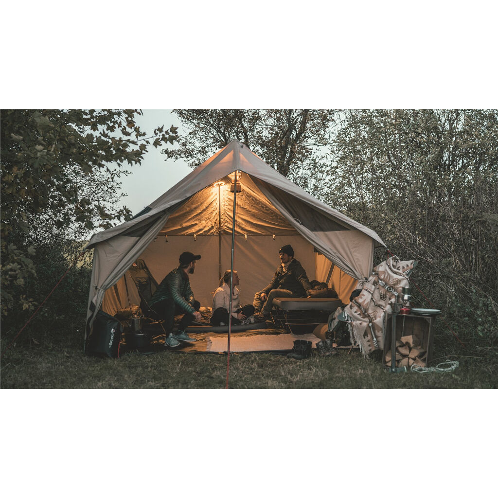 Ruime kampeertent voor maximaal 8 personen met een duurzame doek van technisch katoen, vaste vloer en een stabiel stalen frame. De tent kan worden aangevuld met een binnentent voor 5 personen, een tentkachel en een tarp die aan de voorkant wordt gemonteerd.