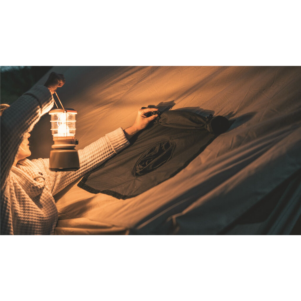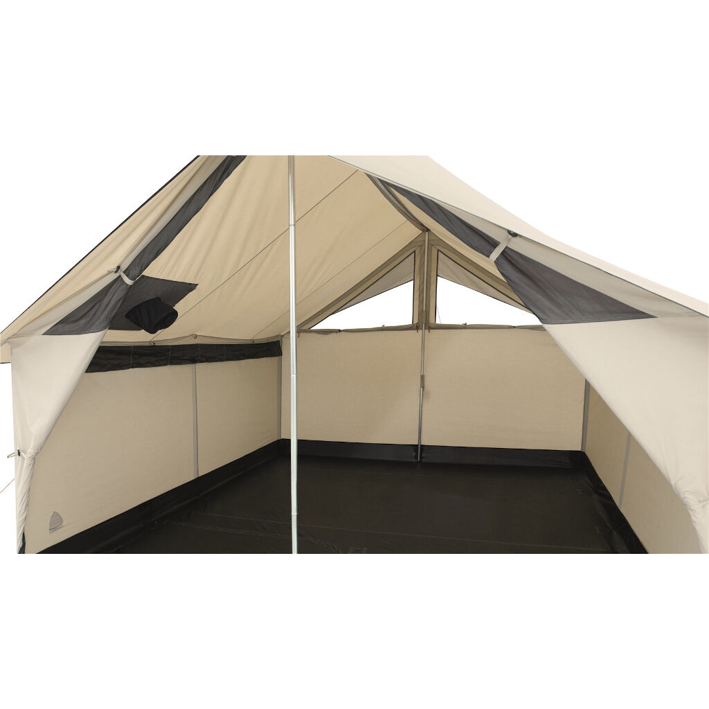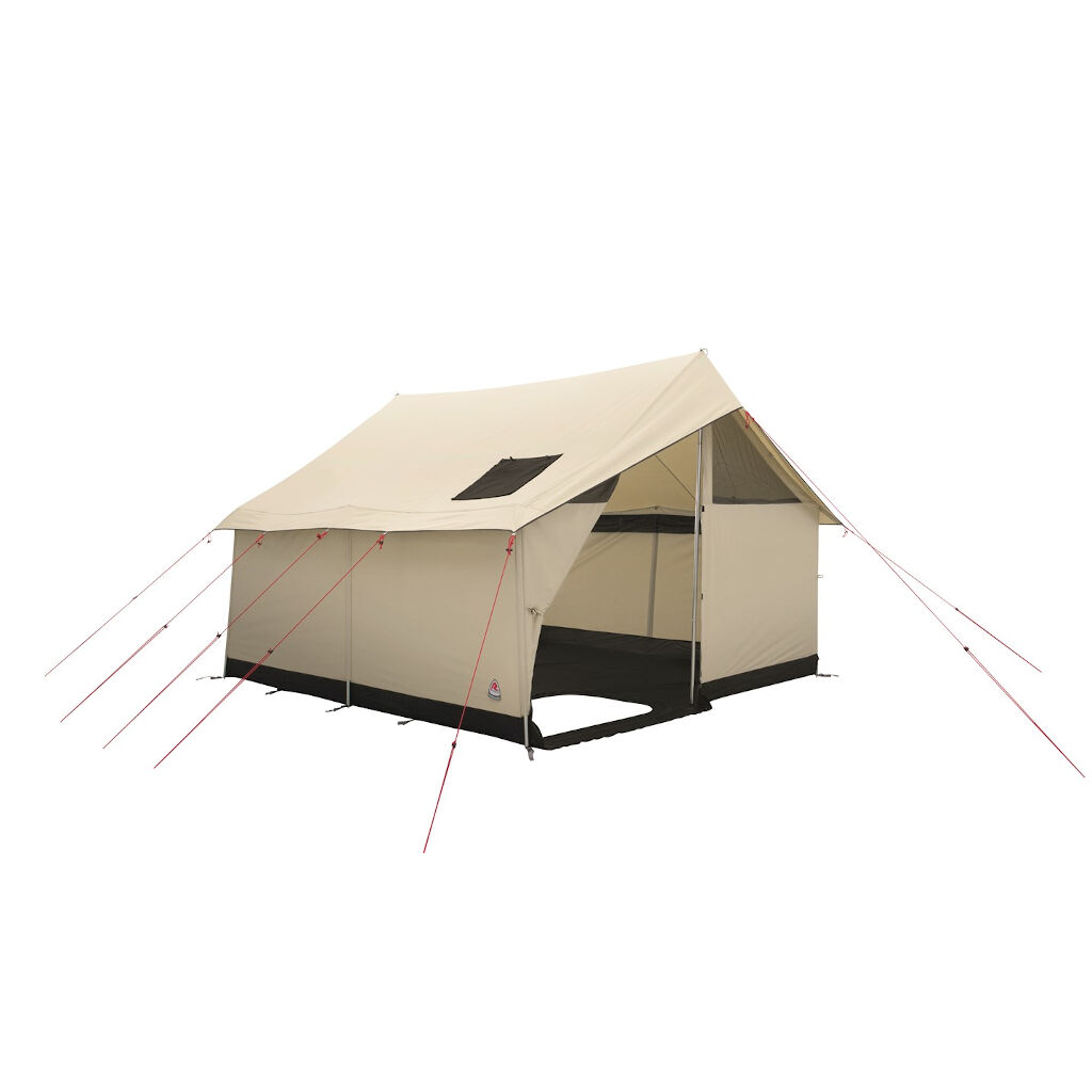 De tent is gemakkelijk toegankelijk via de grote opening aan de voorkant, die volledig kan worden geopend om de tent te luchten op warme dagen. Twee grote openingen voor en achter in de tent fungeren als ramen om meer licht binnen te laten en de tent te ventileren. Het dak is voorbereid voor een kachel en de vloer heeft een met ritsen afsluitbare opening zodat de kachel of vonken van de opening de vloer niet kunnen beschadigen. De Robens Prospector Castle heeft ook goede accessoires en kan worden aangevuld met een kachel, een tarp voor de ingang en een binnentent voor 5 personen. De tent wordt opgezet door de zijstokken in de externe stokkanalen te schuiven en de lijnen uit te spannen. De nok met poten wordt vervolgens van binnenuit de tent gemonteerd.