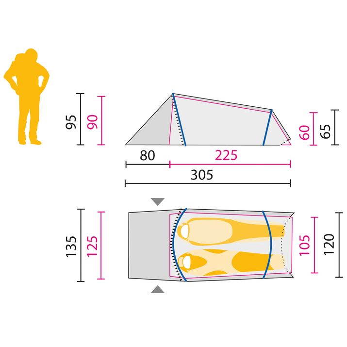 - Afmetingen binnentent: 225 x 125/105 x 90/60 cm (L x B x H)