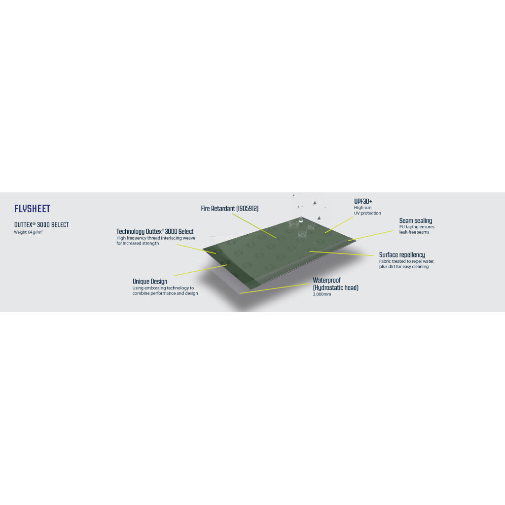 Het Outwell Wind Guard System, waarbij het buitendoek, de stokken en de scheerlijnen met elkaar verbonden zijn, zorgt voor zeer goede prestaties bij harde wind. Het doek is vlamvertragend en volledig waterdicht met een waterkolom van 3000 mm en getapete naden.