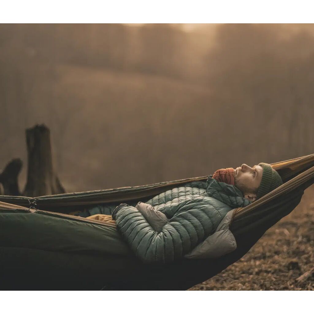 Isolatie die onder de hangmat wordt gehangen. Eenvoudig te bevestigen aan de touwen/banden van de hangmat. Trek bovenaan aan om de isolatie over de rand van de hangmat te spannen voor maximale warmte en comfort.