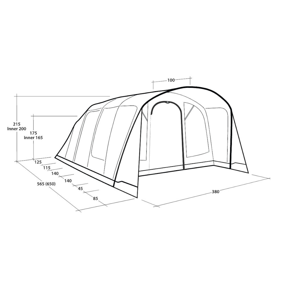 Snel op te zetten familietent met luchtbuizen en royale plafondhoogte, een extra diep zonneluifel en een leefruimte van 280 x 380 cm. Dankzij de Rigid Air-technologie hoeft u alleen de tentstof aan de grond te bevestigen en de luchtkanalen op te pompen met de meegeleverde pomp. De enige gebruikte stok is voor de zonneluifel en kan worden gemonteerd zodra de tent is opgezet. De vastgenaaide vloer biedt effectieve bescherming tegen vuil, tocht en insecten, en de tent is in slechts enkele minuten klaar voor gebruik. De tent heeft ook grote getinte ramen die zacht, aangenaam licht binnenlaten en tegelijkertijd de inkijk verminderen en beschermen tegen warmte. De familietent heeft twee deuren, één aan de zijkant en één aan de voorkant. De zijingang maakt de binnenste leefruimte gemakkelijk toegankelijk, vergemakkelijkt de plaatsing op de camping en kan op warme dagen worden geopend om de tent te ventileren.