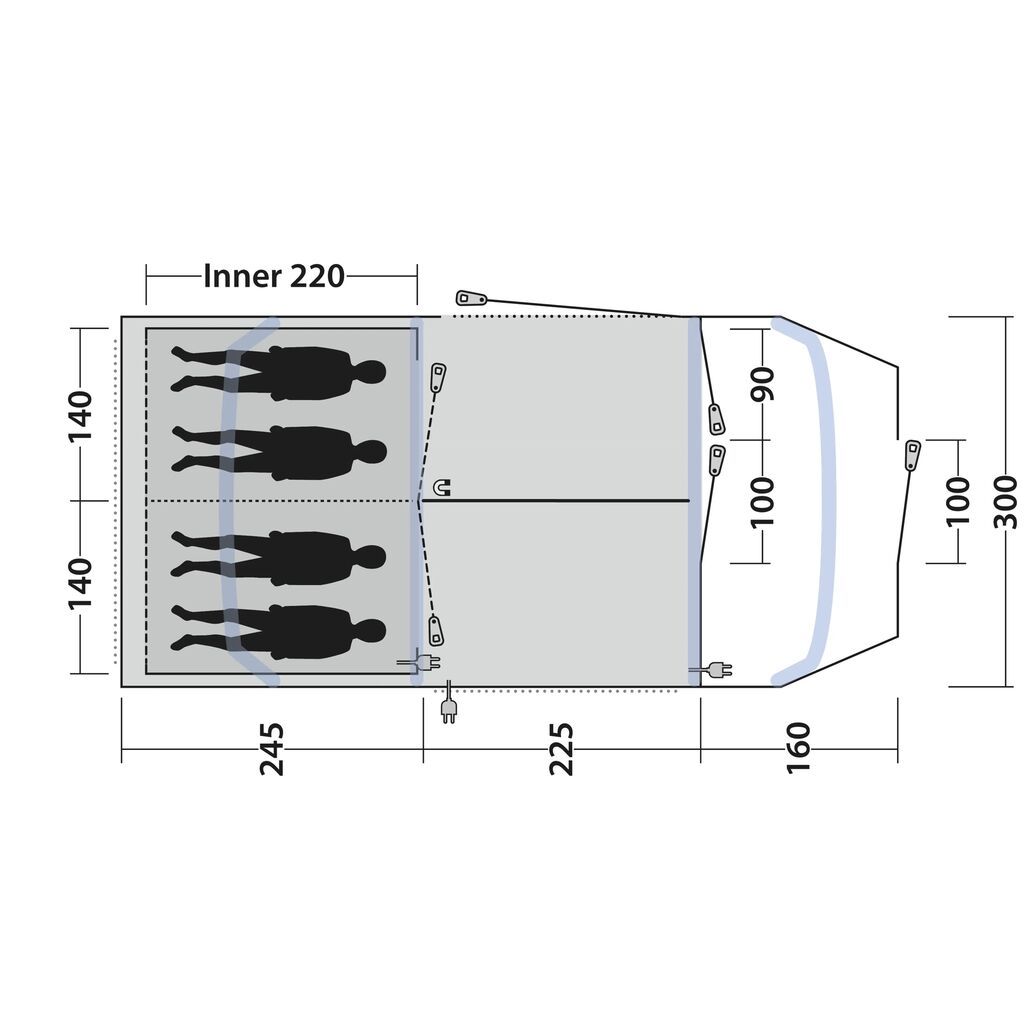 De slaapcabine heeft een magneetstrip naast de ritssluiting, waardoor je stil kunt openen en sluiten (Outwell Quick & Quiet Inner door). Ideaal om anderen niet wakker te maken.
