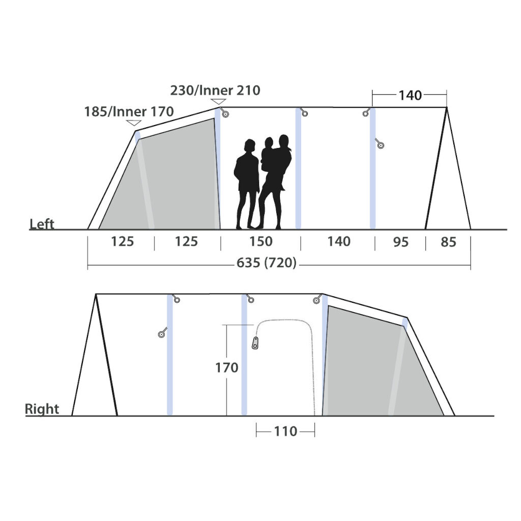 De tent is ingedeeld in drie zones – een opstelling die vaak in het Verenigd Koninkrijk wordt gebruikt: voorruimte (voorportaal), leefruimte en slaapcabines. De voorruimte heeft een uitneembaar grondzeil en kan worden gebruikt als eetruimte, om natte kleding op te hangen of voor het opbergen van uitrusting. De volgende zone is de hoofdleefruimte met een volledig dichtgestikt grondzeil, ideaal om een tapijt neer te leggen en in te richten voor avonden of regenachtige dagen waarop je liever binnen blijft. Een van de slaapcabines kan eenvoudig worden verwijderd om het leefgedeelte te vergroten. De slaapzone bestaat uit drie aparte slaapcabines met een gang ertussen en een extra achterdeur voor directe toegang.