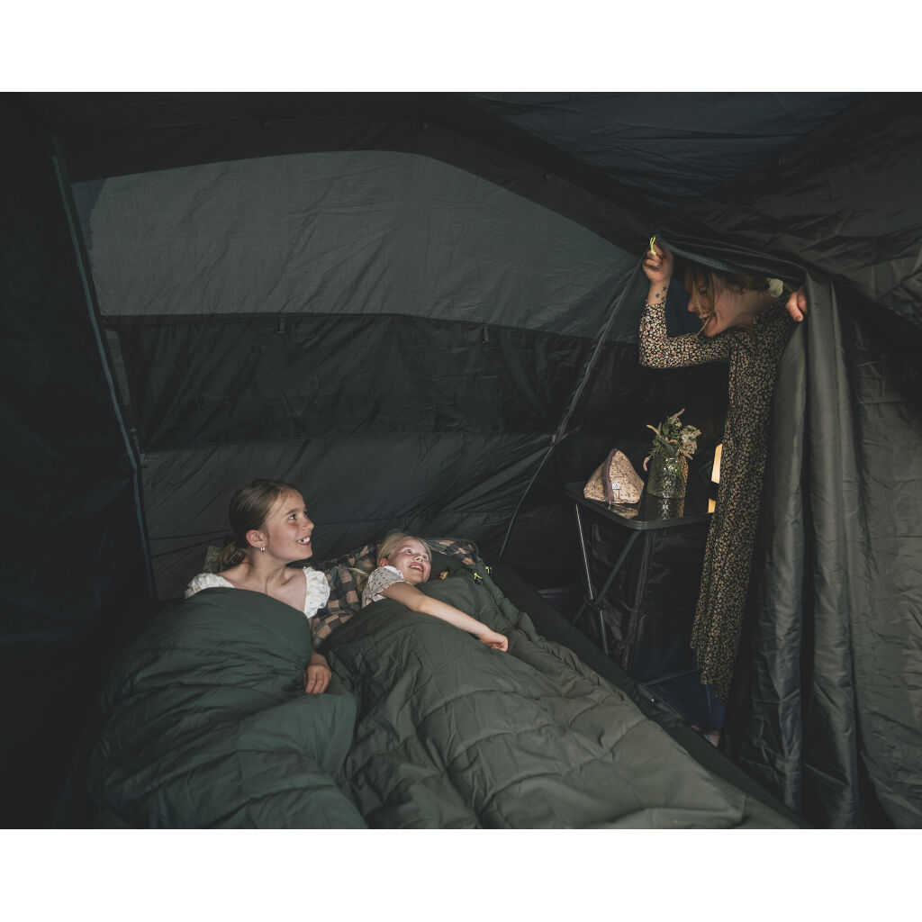 De tent heeft drie aparte slaapcabines: een grote cabine voor drie personen aan de ene kant en twee cabines voor twee personen aan de andere kant. Een gang loopt tussen de slaapcabines. Een uniek detail is de extra ruime slaapcabine, die extra ruimte biedt in zowel de lengte als de hoogte in vergelijking met standaard tentcabines, waar de bedden meestal de volledige lengte innemen en de achterwand vaak laag is over een groot deel van de kamer. Perfect om bagage in de cabine op te bergen of gewoon wat extra ruimte te hebben om te bewegen.