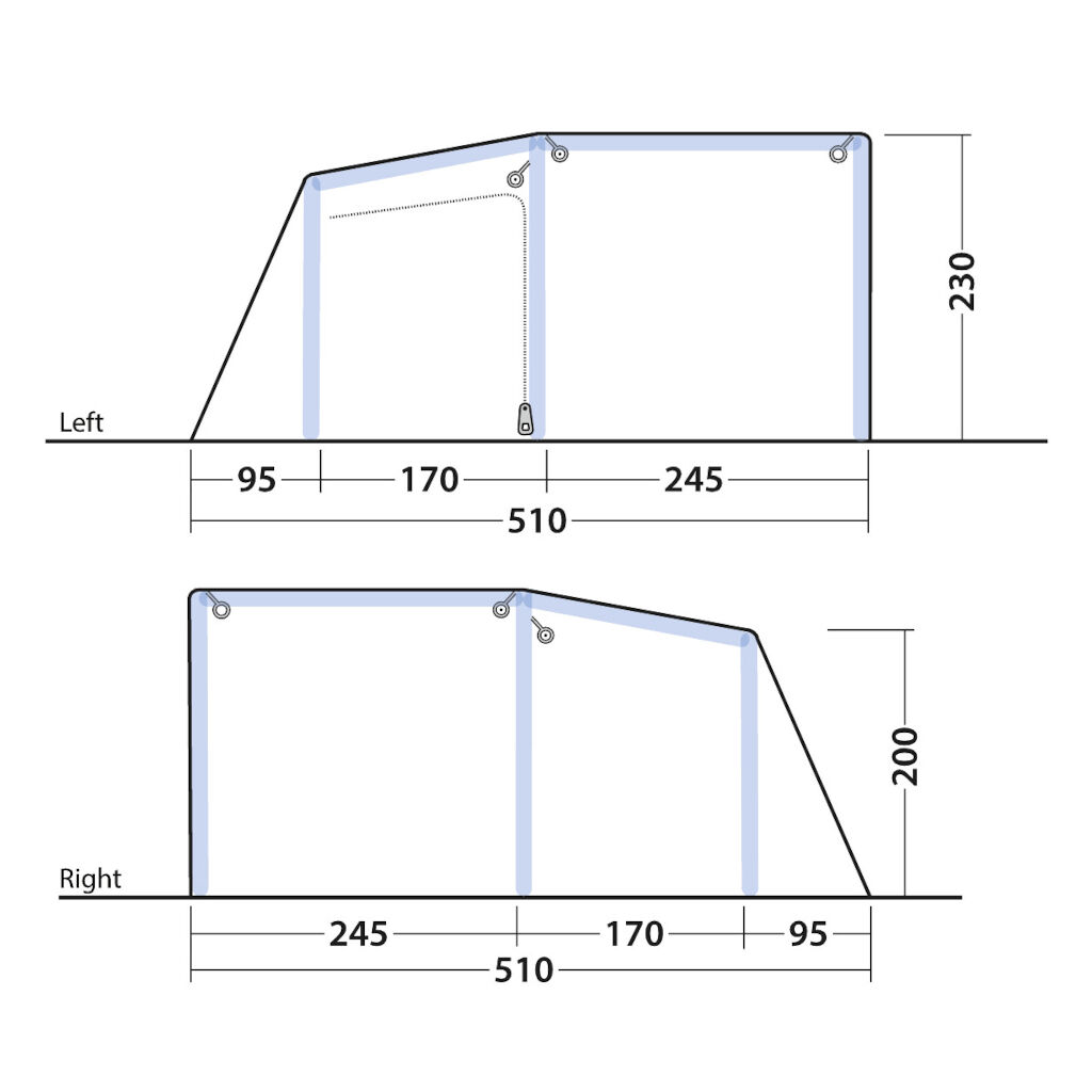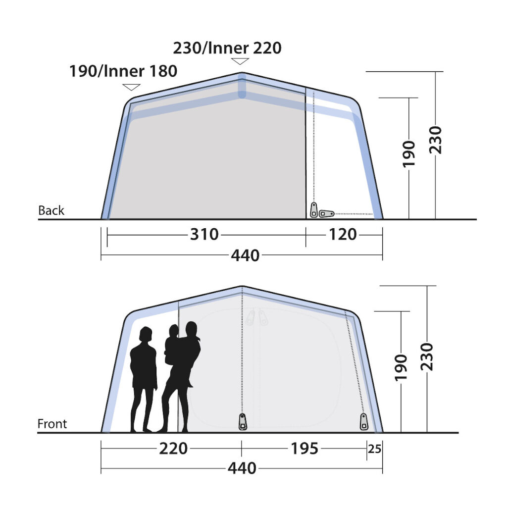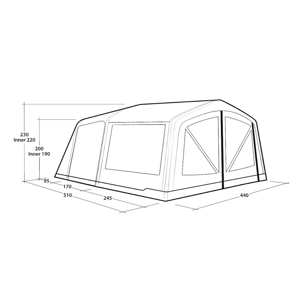 Het boxy ontwerp en de gevormde luchtkanalen zorgen voor royale stahoogte en betere bewegingsvrijheid. Getinte ramen en flexibele gordijnen verminderen warmte en inkijk, terwijl ventilatie aan de achterzijde en in de zijdeur zorgt voor een goede luchtstroom, zelfs op warme dagen. Dankzij het One Air System kan de tent snel worden opgezet via één ventiel, en het volledig ingenaaide grondzeil beschermt tegen wind, insecten en vuil.
