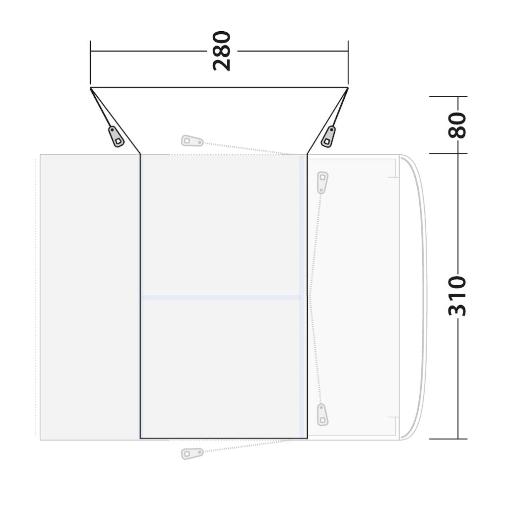 Met deze voertuigverbinding kunt u hogere voertuigen zoals Sprinter en Ducato verbinden met de bustent Outwell Jonesville 290 of 440SA. De verbinding is gemaakt van hetzelfde duurzame materiaal als de tent, en als u de bus wilt gebruiken en de tent wilt achterlaten, kunt u eenvoudig loskoppelen en wegrijden. Bevestig eenvoudig aan de luifelrail of kederspoor van het voertuig en aan de grond aan de andere kant van de tent. Dankzij de montage functioneert de verbinding ook deels als dakbescherming en biedt een weersbestendige verbinding tussen tent en voertuig. Perfect voor hogere voertuigen die een vrijstaande bustent willen.