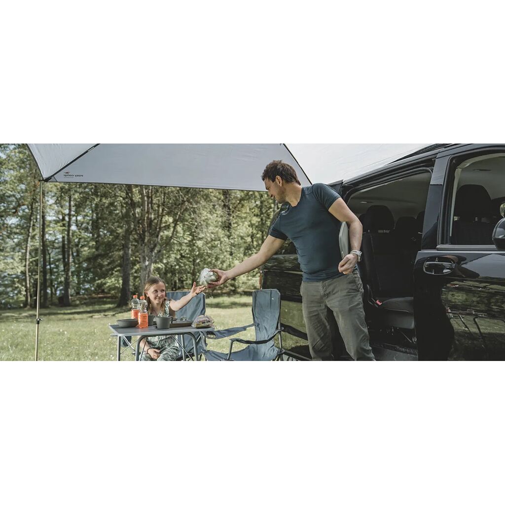 Luifel/zonneluifel met extra stahoogte dankzij dwarsstangen, waardoor je in de schaduw kunt zitten of beschermd bent tegen de regen, slechts enkele minuten nadat de caravan of auto op zijn plaats staat. Eenvoudig te monteren door deze in de rail van de caravan of auto te schuiven, met klittenband rond de rail van het voertuig te bevestigen of door scheerlijnen over het voertuig te spannen (niet inbegrepen).