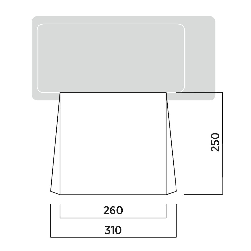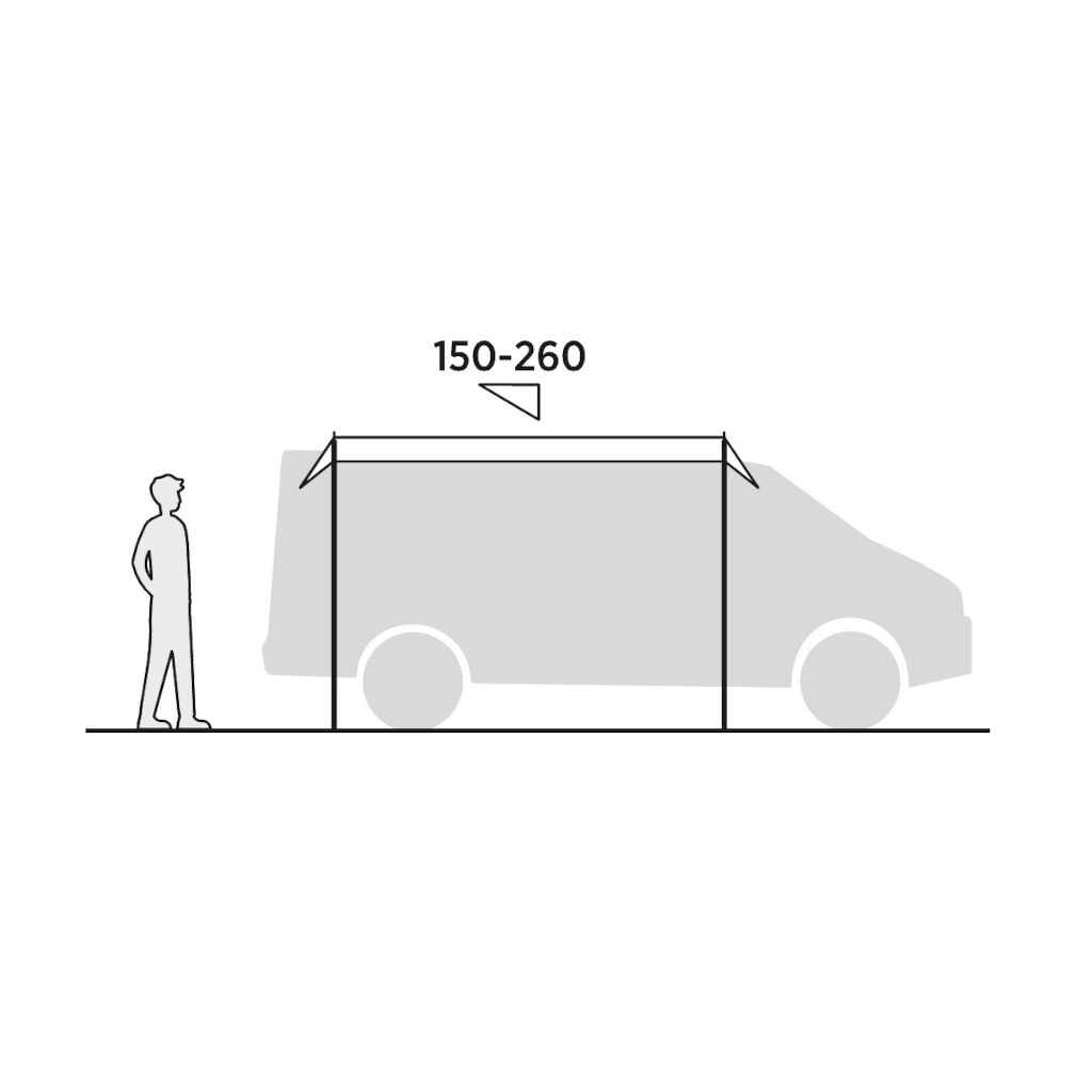 Luifel voor bestelwagens, caravans en kleinere campers van 2,5 x 2,6 meter. Dankzij een klein pakformaat is het gemakkelijk mee te nemen en eenvoudig te monteren wanneer je een beschutte buitenruimte nodig hebt. Kan worden bevestigd via een kederspoor (5+7 mm) of met lijnen over de auto.