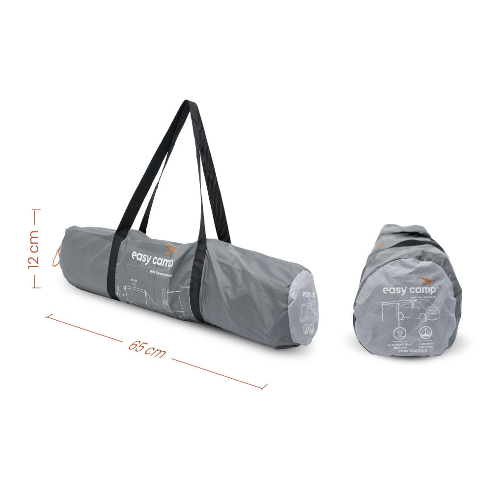 Luifel/zonneluifel die je de mogelijkheid biedt om in de schaduw te zitten of beschermd te zijn tegen de regen, slechts enkele minuten nadat de caravan of auto op zijn plaats staat. Eenvoudig te monteren door deze in de rail van de caravan of auto te schuiven of door scheerlijnen over het voertuig te spannen.