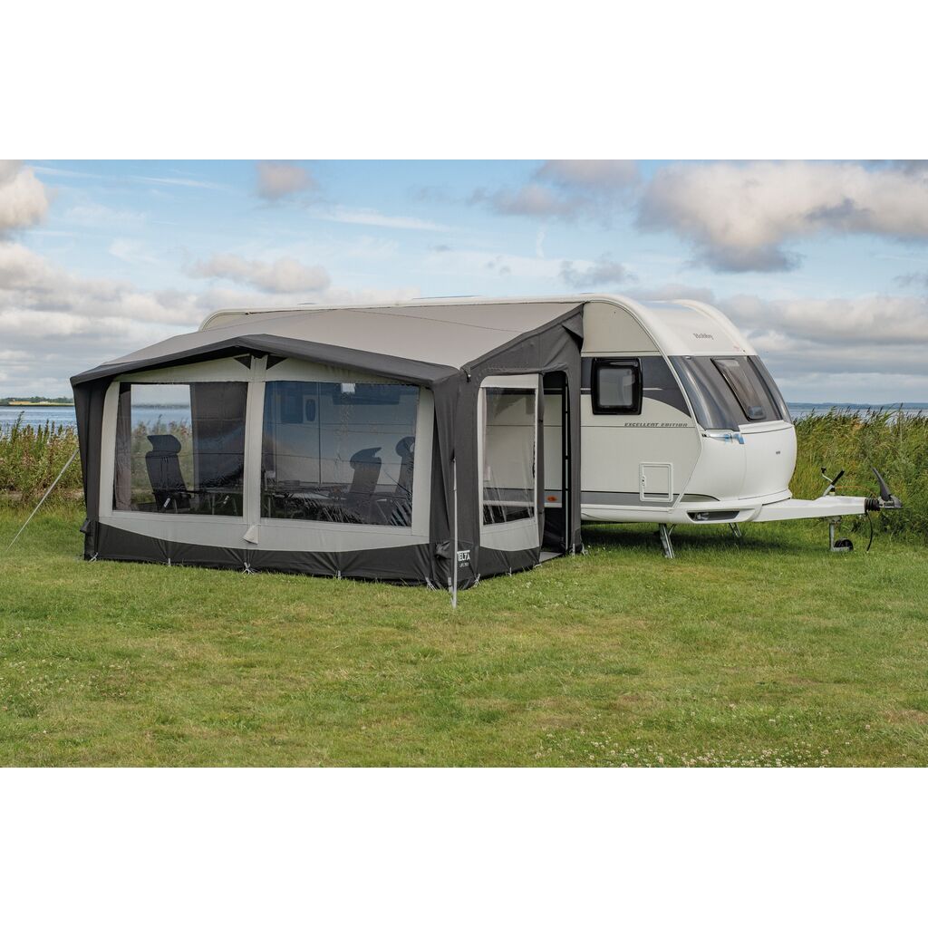 Telta Estate 390 heeft twee kederlijsten van 5 en 7 mm en is daardoor geschikt voor zowel caravans als campers. Dubbele ritsen bovenaan de zijkanten maken het zeer eenvoudig om de hoogte aan te passen door één of beide ritsen te openen.