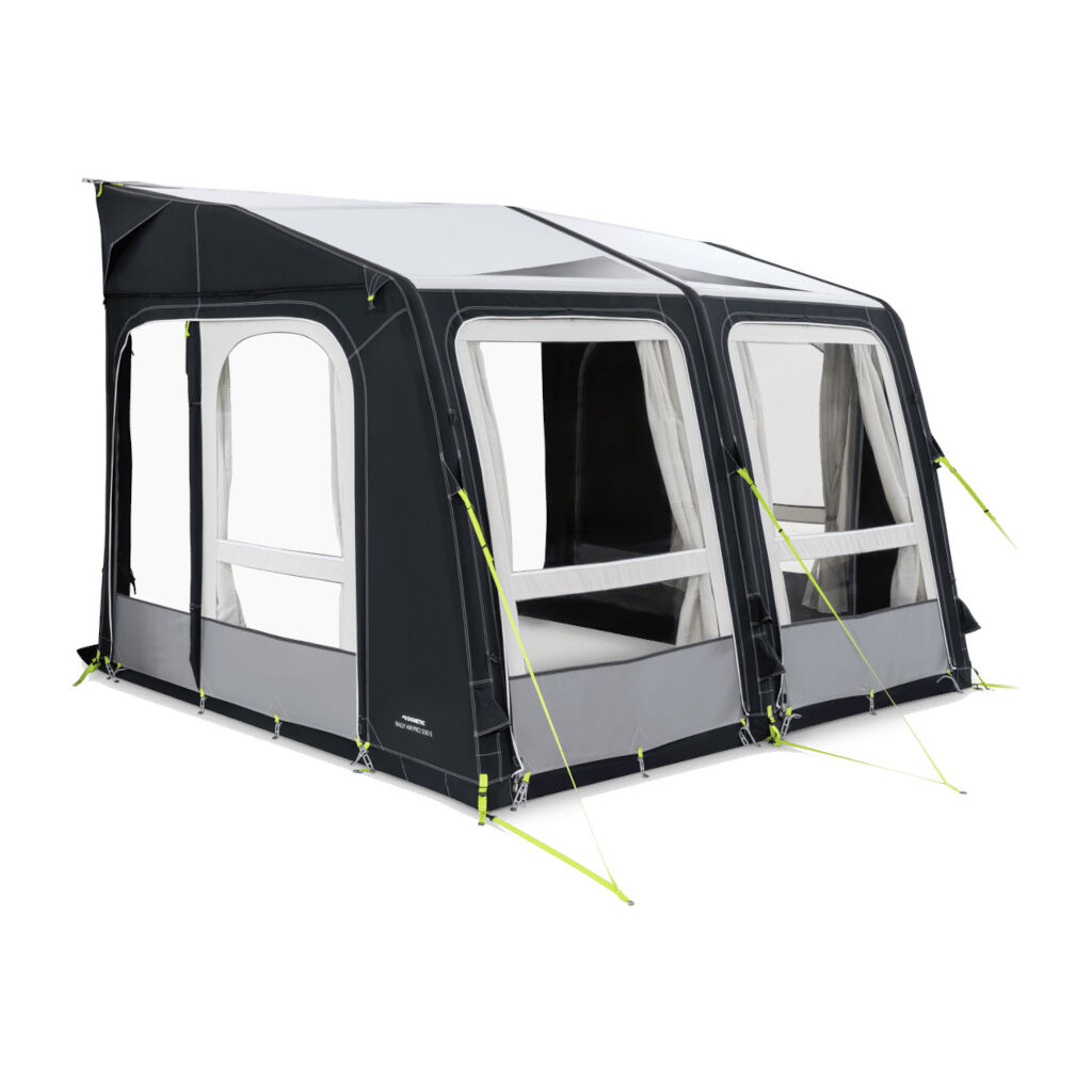 Dometics Rallt Air Pro is een gemakkelijk op te zetten en flexibele voortent met luchtkanalen. De tent is extreem eenvoudig te monteren en op te zetten en kan dankzij dubbele keders op zowel caravan als camper worden gemonteerd. Bevestig gewoon het tentdoek aan de lijst van de caravan of de luifel van de camper, zet vier haringen in de hoeken en pomp de in het tentdoek geïntegreerde kanalen op die het frame vormen vanuit een ventiel op de tent. Bevestig vervolgens de afdichting tegen de caravan en de tent is klaar voor gebruik. Grote raampanelen rondom de tent en in het dak zorgen voor goed licht en een prachtig uitzicht. Zowel de voor- als zijpanelen kunnen worden geopend op warme dagen.