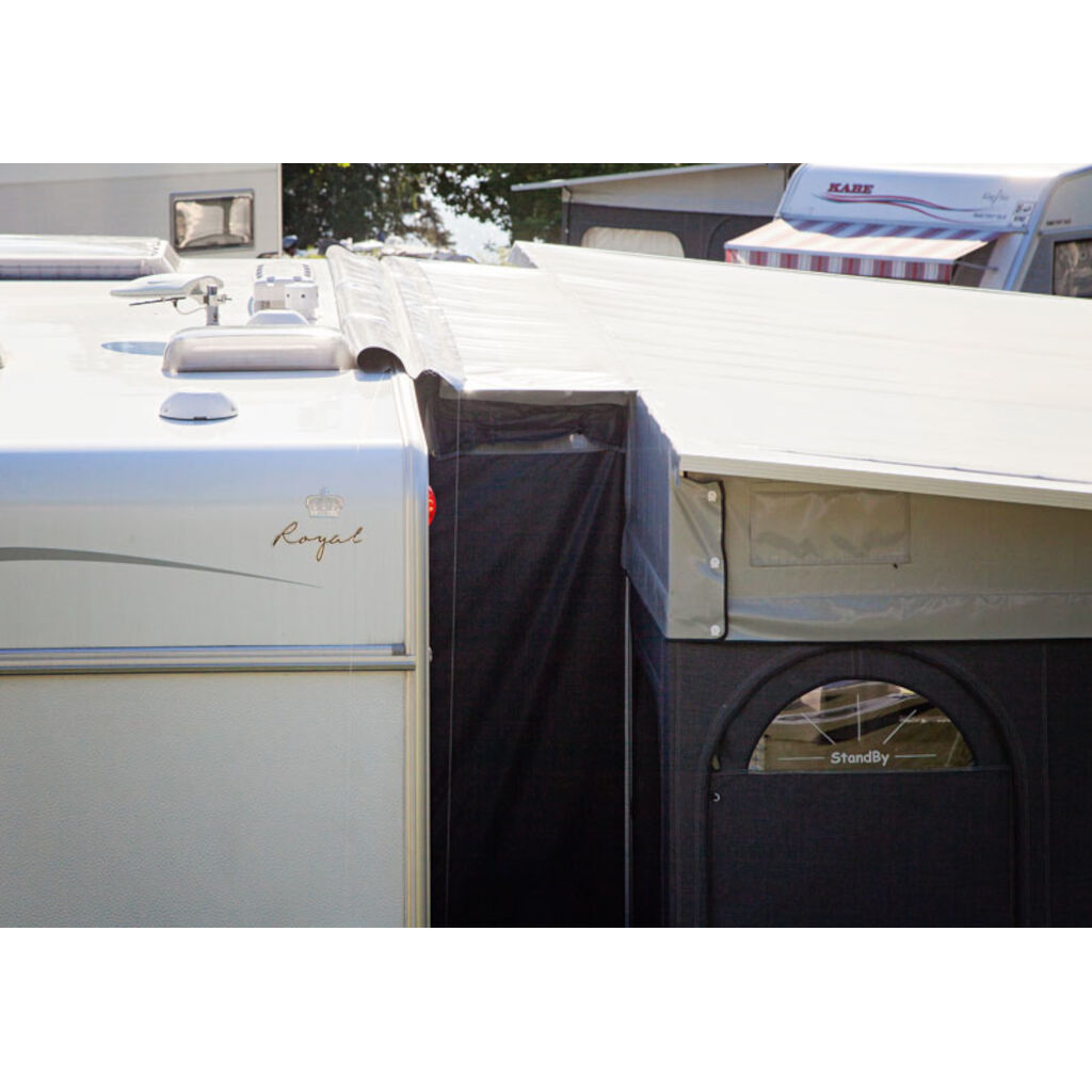 Standby wordt compleet geleverd met sluisverbinding, binnendak, gordijnen, caravanskirt en achterwand.